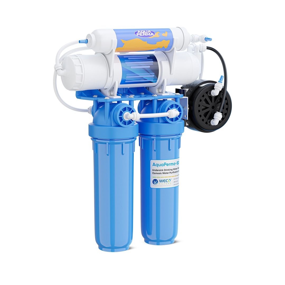 The WECO AquaPerma is a high-efficiency under-sink reverse osmosis drinking water purification system that utilizes a permeate pump to maximize water storage. By taking full advantage of your household's water pressure, the AquaPerma ensures that your pressurized water storage tank is always full, providing you with ample purified water. The system is crafted with premium, USA-made filter cartridges, parts, and components, ensuring the highest quality performance.