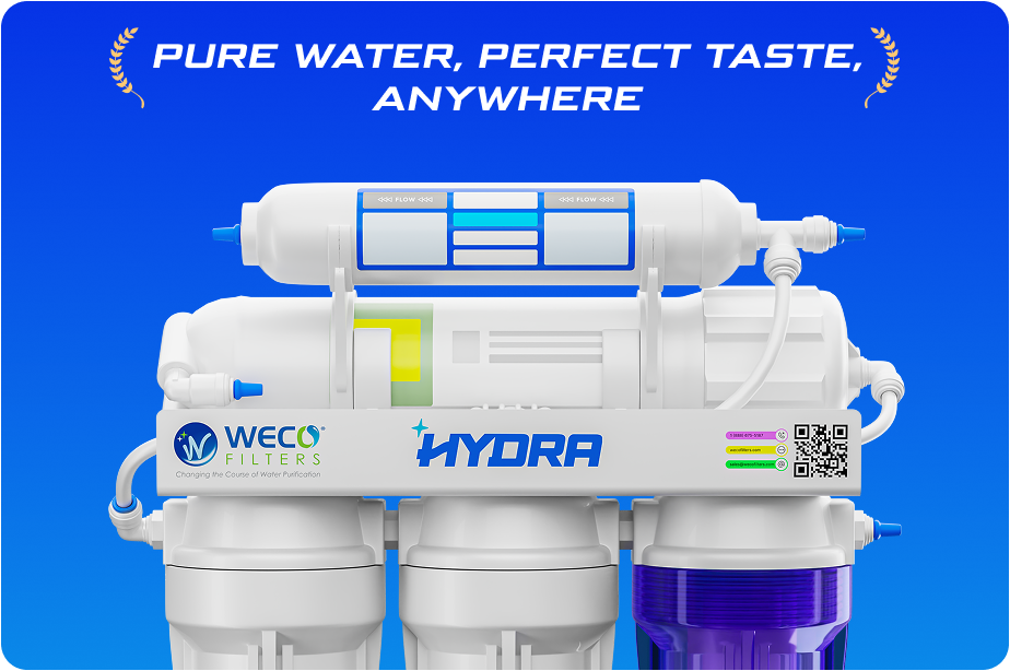 The WECO Hydra reverse osmosis system delivers clean, fresh-tasting water for homes, offices, gyms, juice bars, and coffee shops. It uses multiple filtration stages:
