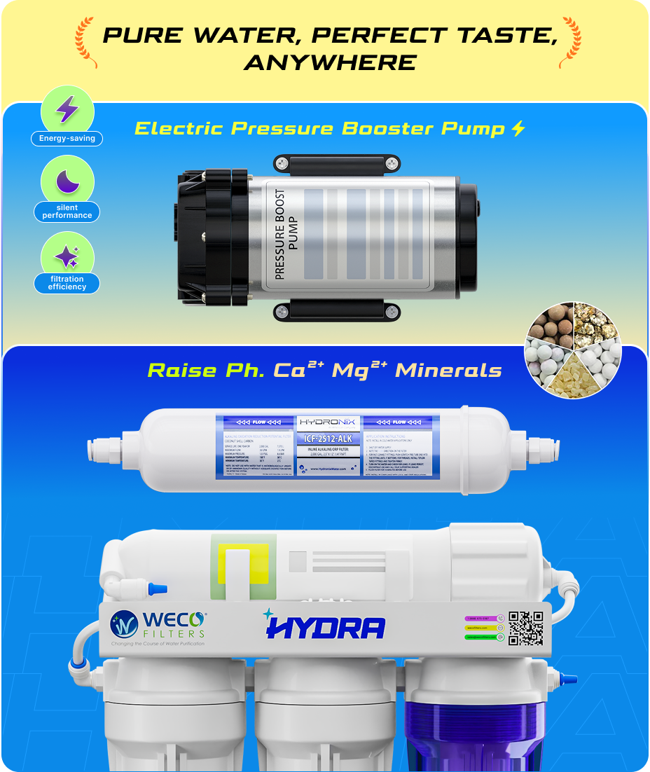 The WECO Hydra reverse osmosis system delivers clean, fresh-tasting water for homes, offices, gyms, juice bars, and coffee shops. It uses multiple filtration stages: