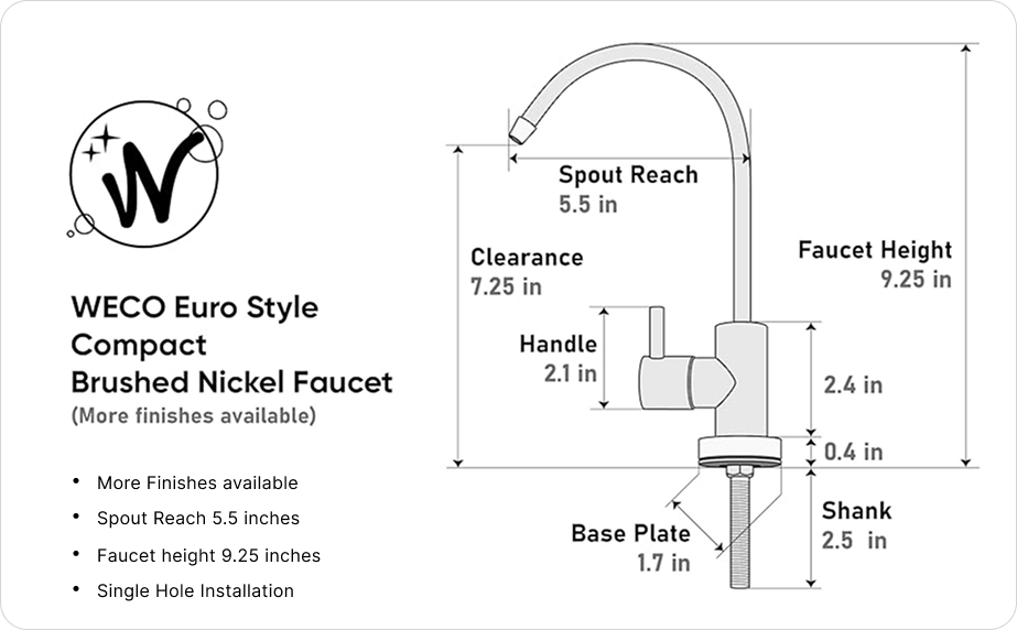 The WECO reverse osmosis filtration system also includes a pressurized water storage tank and a brushed nickel designer faucet for dispensing the purified water. WECO reverse osmosis systems use NSF-certified (Standard 61, Section 9) lead-free dispensing faucets. The faucets look attractive, fit into any decor and are certified lead-free to protect you, your family and pets. As the filtration system makes purified water, it fills the storage tank (up to 3 gallons at a time).