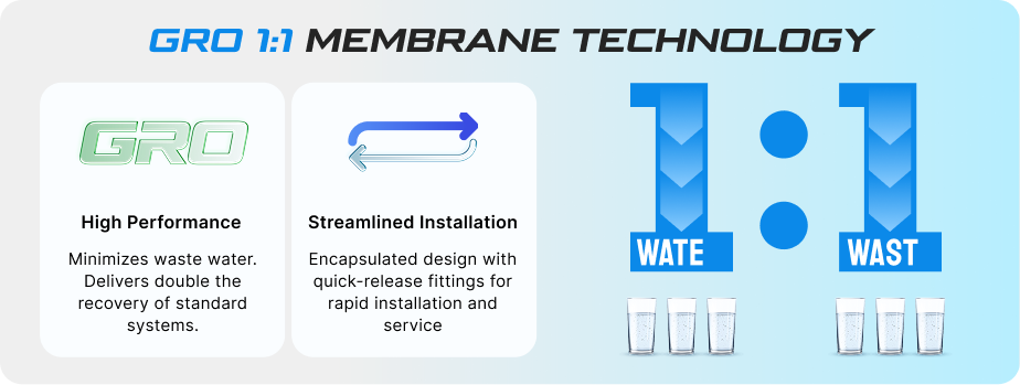 Pentair's GRO integrates a 100% dry membrane to help maximize its lifespan and provide enhanced performance to the end user. The GRO boasts a 50% recovery rate while maintaining a retrofit-able design for easy integration.